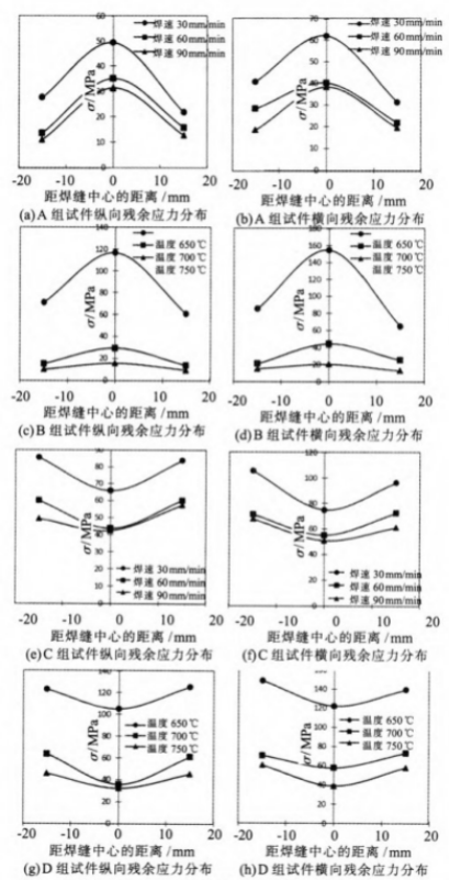 2. 拘束條件下:C組試件:其他焊接條件相同,分別選取焊速為30、60、90mm/min;D組試件:其他焊接條件相同,分別選取熱處理溫度為650、700、750℃。